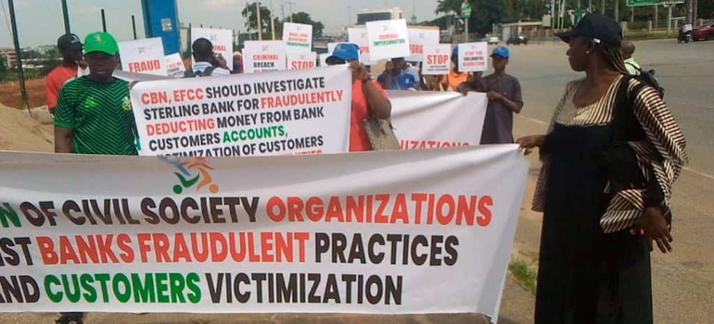 A Coalition of Civil Society Organisations against Banks’ Fraudulent Practices and Customers’ Victimisation, on Wednesday, staged a peaceful protest at the Abuja headquarters of the Central Bank of Nigeria and the Abuja branch of Sterling Bank Plc.