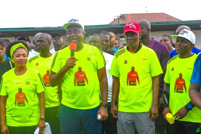 The five-kilometer walk, which took off from the Berger Junction at 6.30 am and terminated at the Samson Siasia Sports Complex in Yenagoa, the state capital, also had his wife, Dr. Gloria Diri, his deputy, Senator Lawrence Ewhrudjakpo, government functionaries and civil servants as participants.