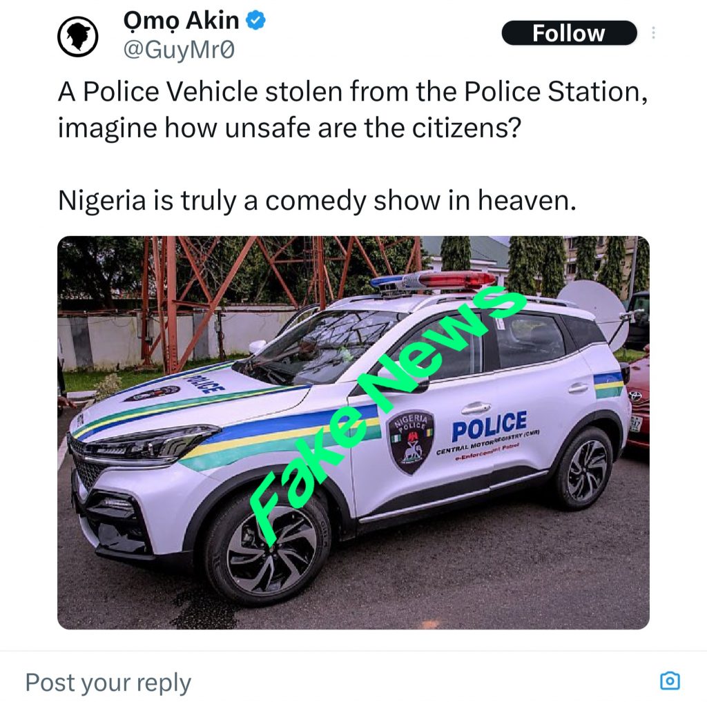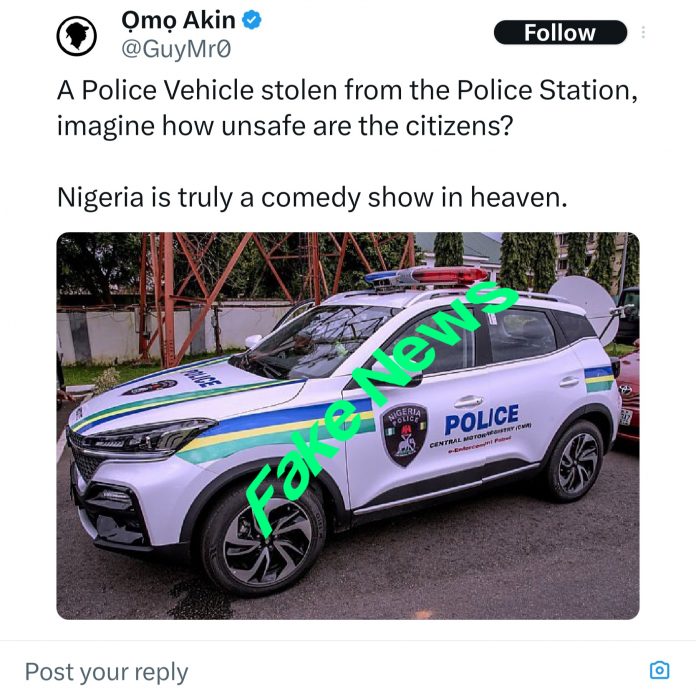 The post, made by a user identified as Omo Akin with the handle @GuyMr0 on X (formerly Twitter), claimed that a police patrol vehicle had been stolen and shared a picture to support the allegation. The caption read: “A Police Vehicle stolen from the Police Station, imagine how unsafe are the citizens are?”