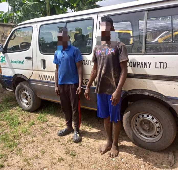 Their arrest led to the recovery of a reported stolen ENTRACO-branded Toyota Hiace bus. Preliminary investigation reveals that the suspects confessed to being members of a vehicle stealing syndicate, stating that they and their cohorts at large, in the early morning hours of 07/10/2023, scaled the fence into the vehicle’s owner’s compound at One-Day, Awkunanaw Enugu, used raw acid to force the gate’s key open and stole the vehicle from where it was parked.