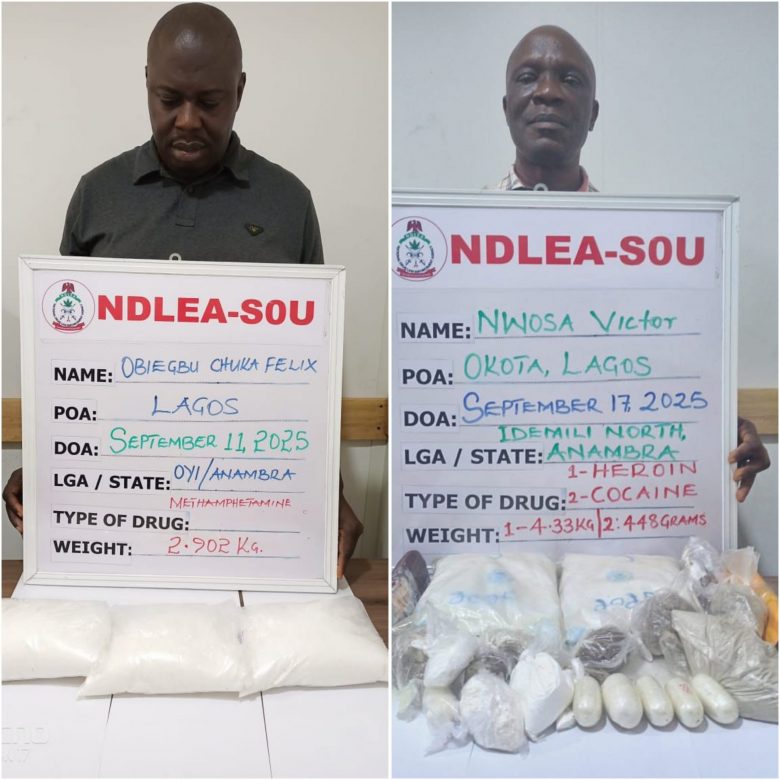 Two drug kingpins: Victor Nwosa and Felix Chika Obiegbu have been arrested by operatives of a Special Operations Unit (SOU) of the National Drug Law Enforcement Agency (NDLEA) after consignments of cocaine, heroin and methamphetamine being prepared for export to Europe and beyond were recovered from their Lagos homes following weeks of intelligence and surveillance on their criminal networks.